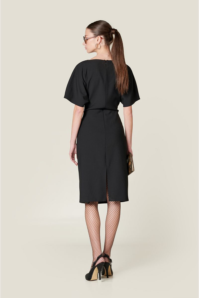 Crna haljina u mješavini vune i poliestera s kimono rukavima i složenim naborima na prednjici. Kopčanje je skriveno na leđima zatvaračem. Tkanina je Bithermic i ima svojstva termoregulacije.