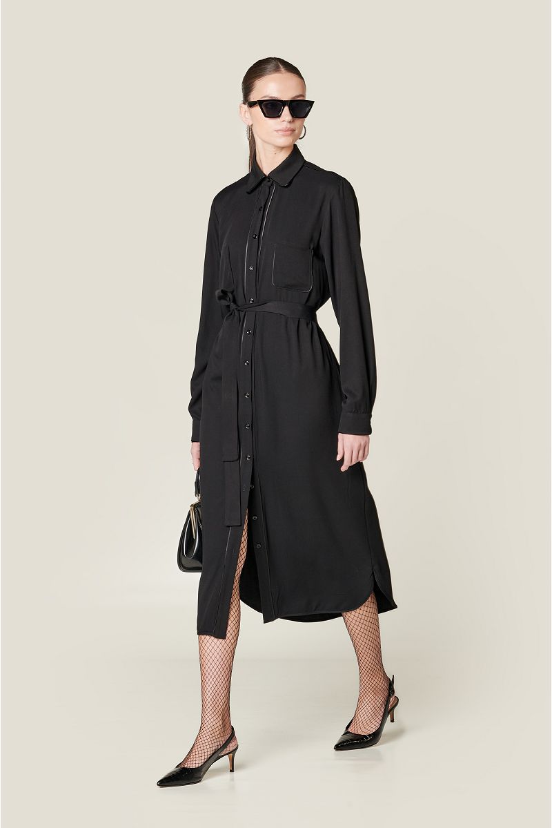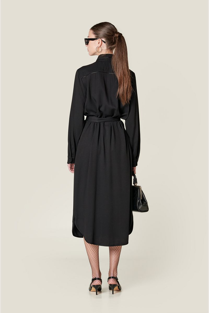 Crna viskozna košulja haljina midi dužine s ukrasnim obrubima, dugih rukava s džepovima na prednjici i u bočnim šavovima. Pojas za vezanje je od istog materijala kao i haljina. Kopčanje je na prednjici gumbima.