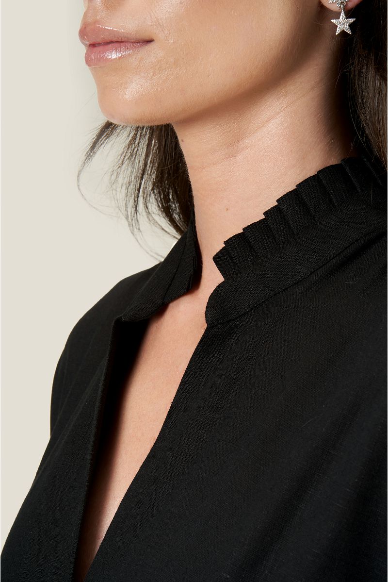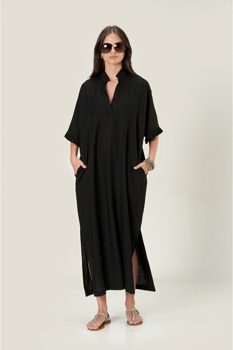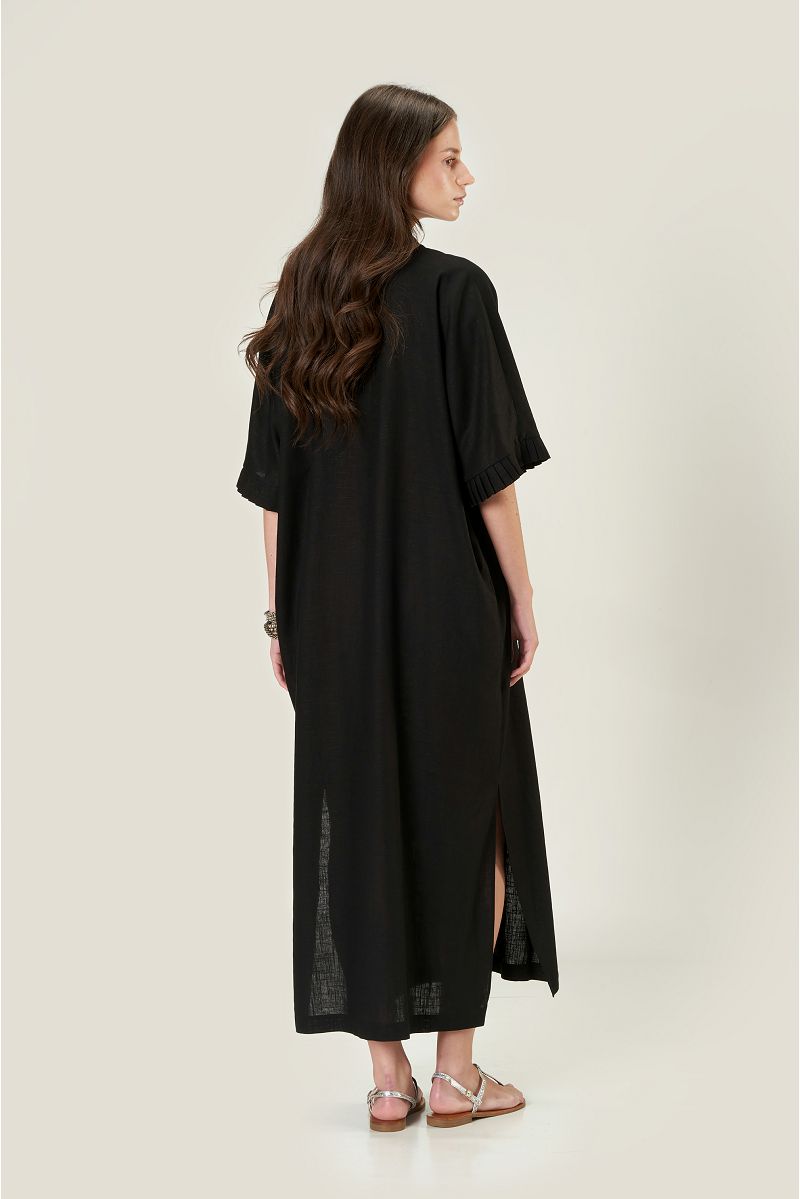 Crni laneni kaftan ravnog kroja sa V izrezom, ruskom kragnom, džepovima u bočnim šavovima, prorezima na boku i ukrasnim faldama na rukavima i kragni.
