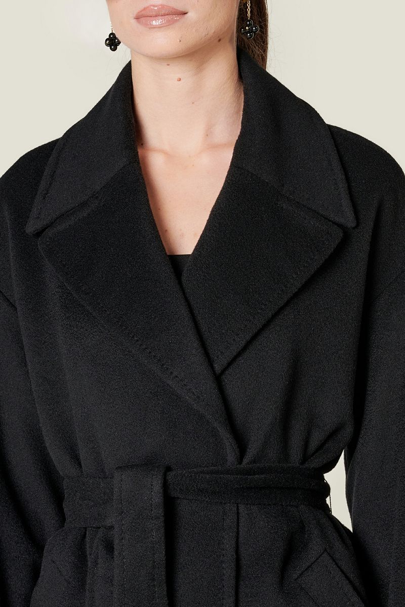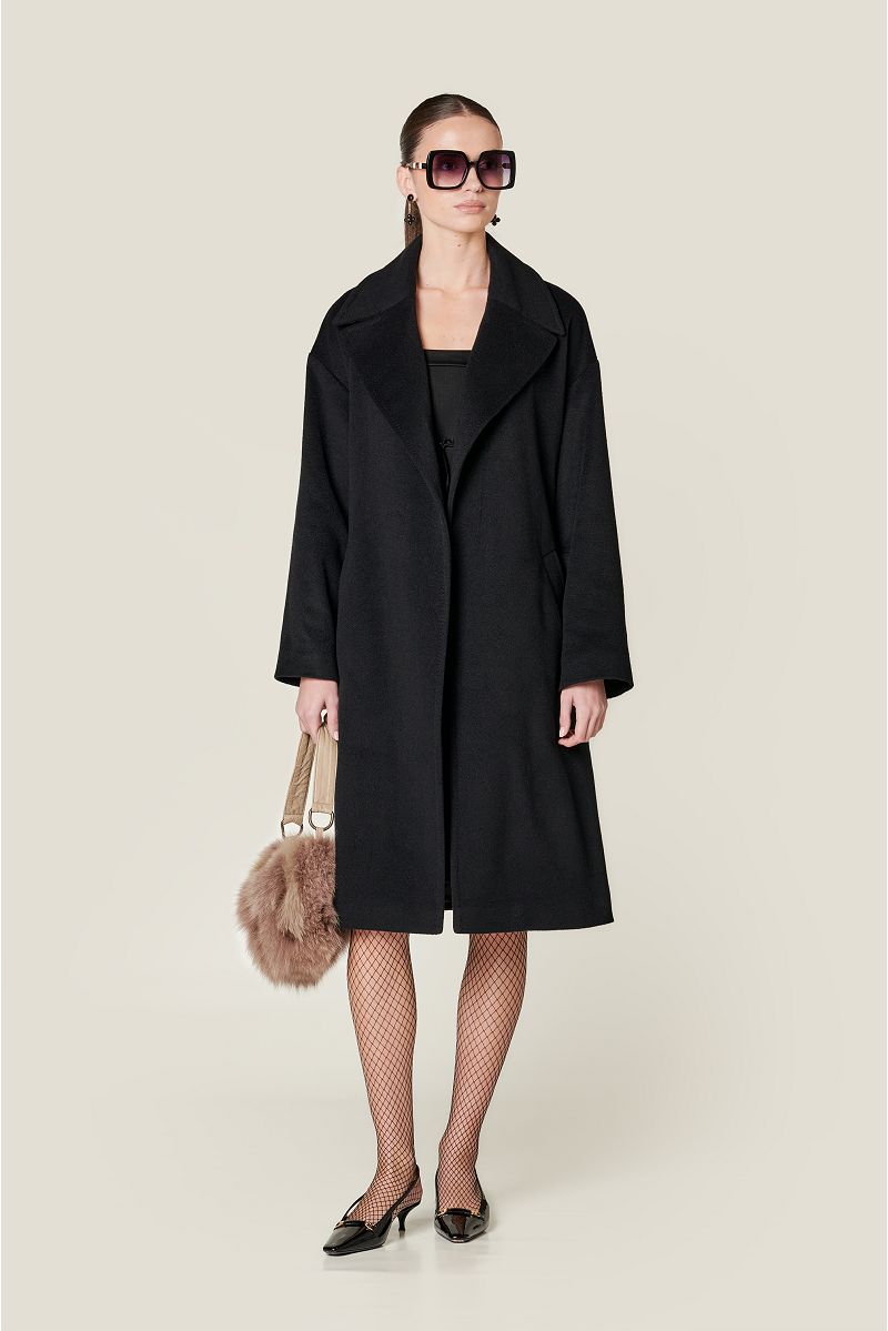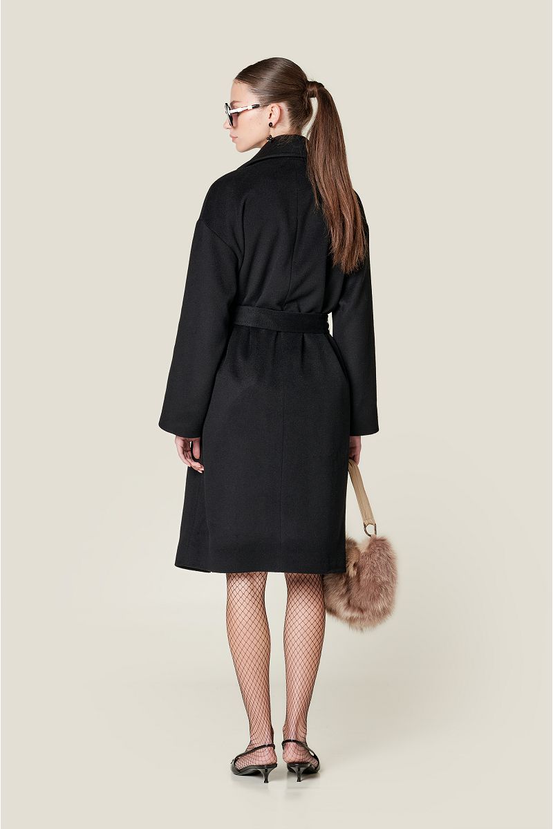 Crni predimenzionirani kratki kaput izrađen od 100% kašmira s ovratnikom s reverima, dugim rukavima i prednjim obrubljenim džepovima . Vezanje je pojasom od istog materijala.