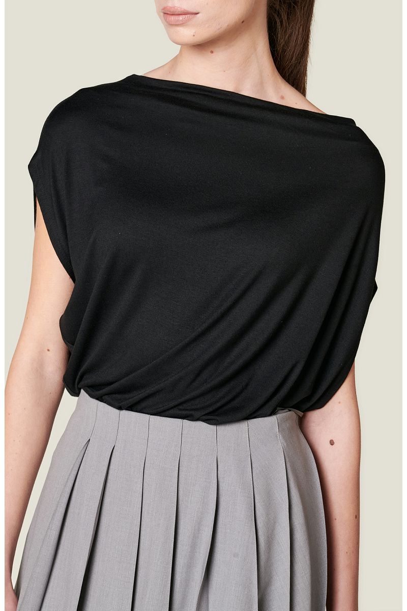 Crna viskozna majica asimetričnog izreza od elastičnog materijala.