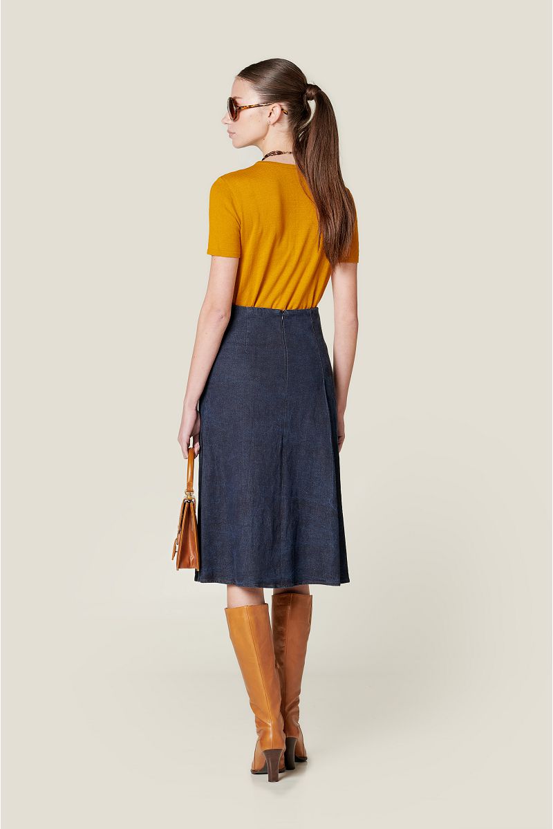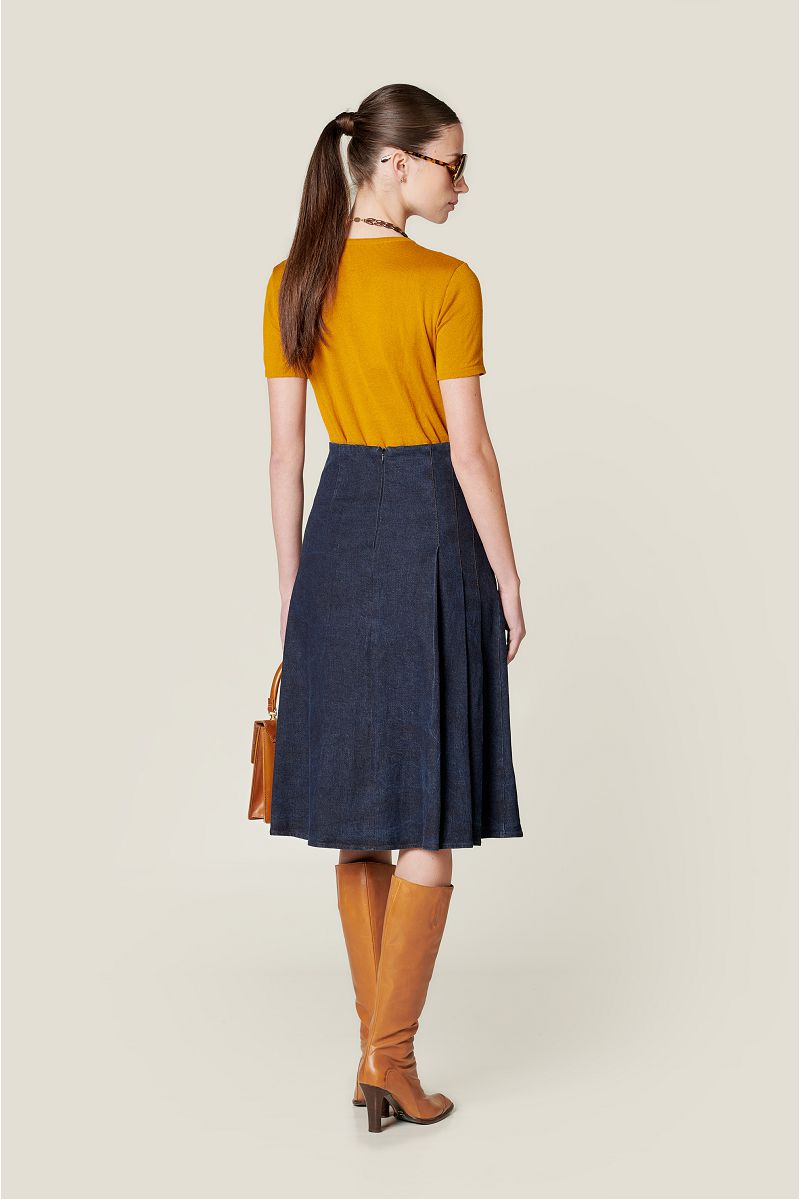 Jeans suknja visokog struka bez pasice s faldama u bočnom dijelu. Kopčanje je skrivenim cifom na stražnjem dijelu.