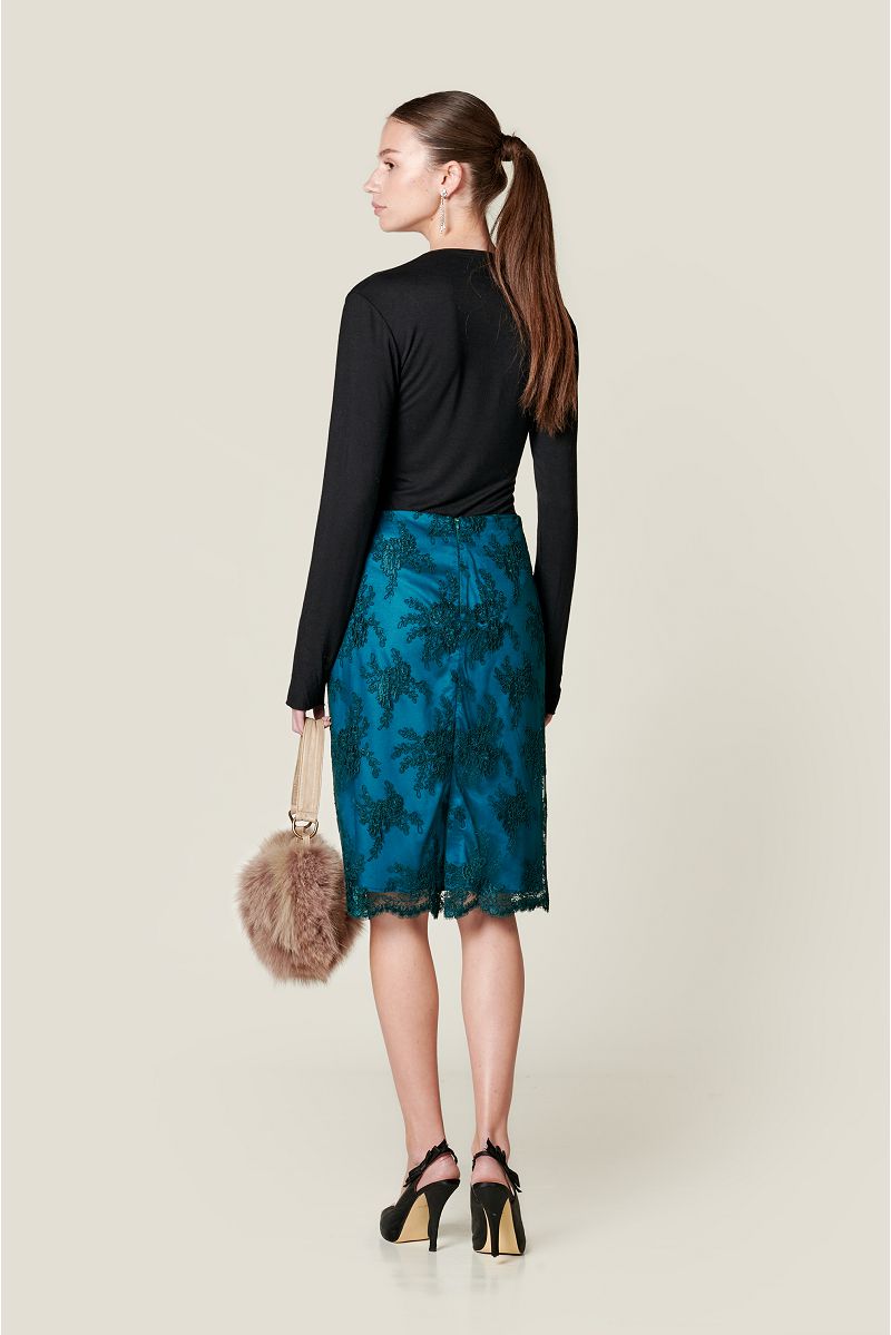 Zelena suknja od čipke ravnog kroja s kopčanjem skrivenim zatvaračem na leđima.