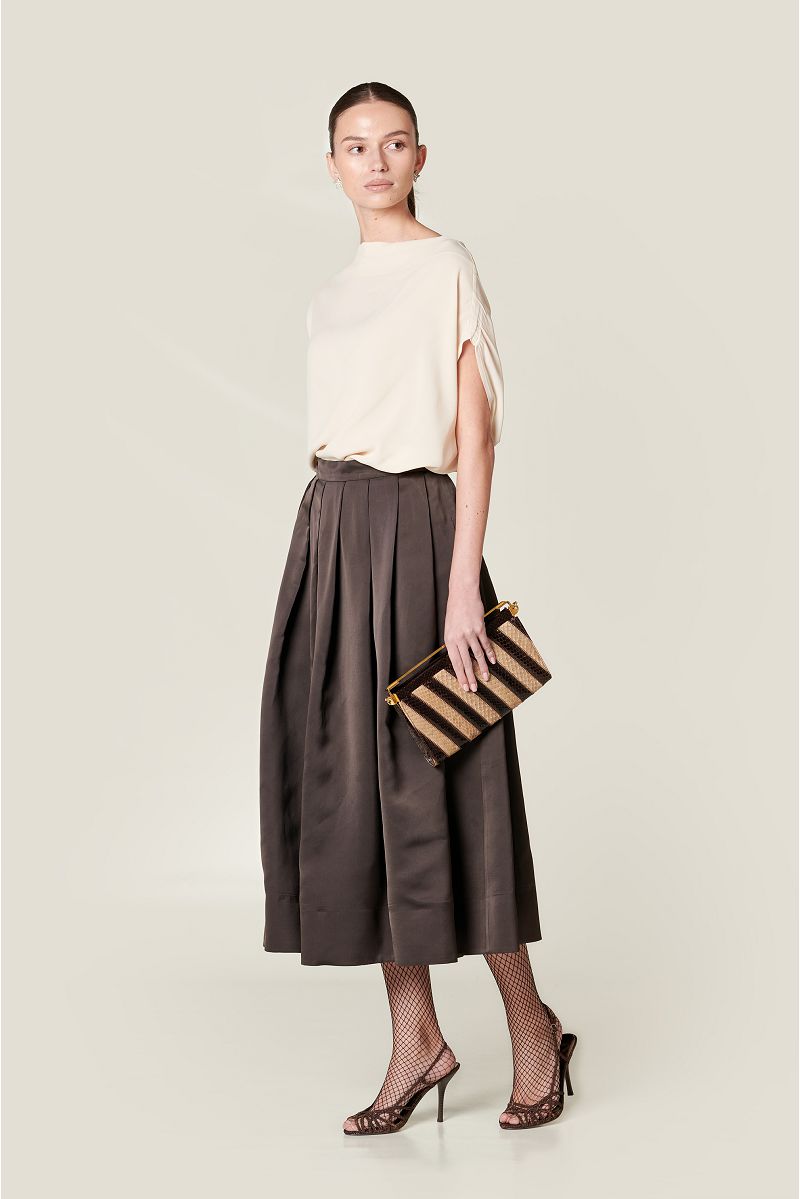 Smeđa midi suknja u kombinaciji viskoze i svile s faldama. Kopčanje je metalnim kopčama, a suknja pokriva dvije veličine.