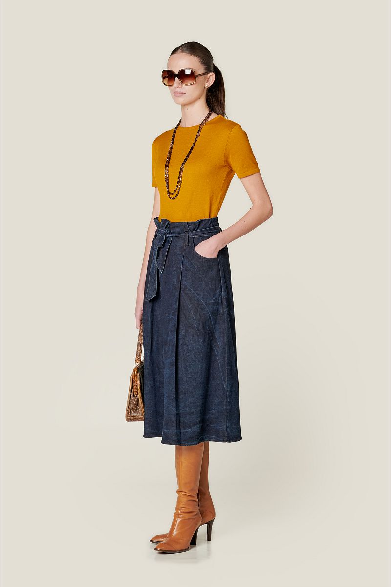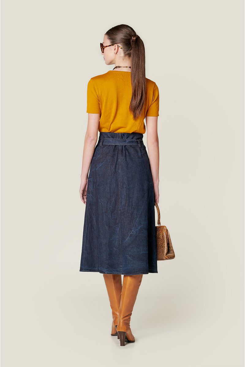 Jeans suknja na vezanje s džepovima i naborima na prednjici.